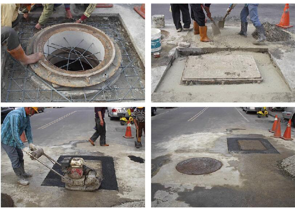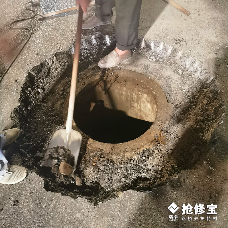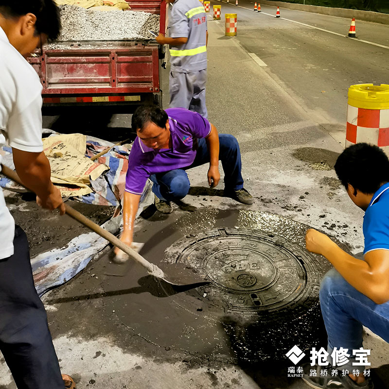 依托该材料的高效施工流程简洁规范:先精准勘察定位井盖高差,标注切割轮廓线,经专业切割破除后清理基面;按1:(0.13~0.15)的水料比搅拌抢修宝RT-2砂浆,快速完成井盖抬升找平与周边填充;最后经2小时短期养护,即可达到通车强度要求。确保修复后井盖与路面高差≤3mm,平整度达标。
